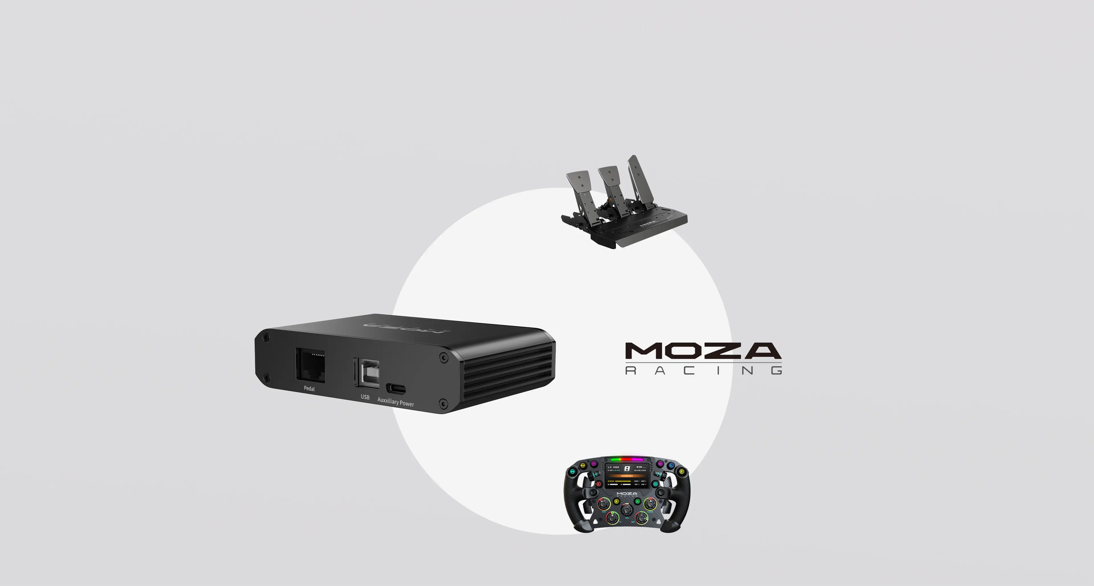4 Eingangsanschlüsse, darunter drei Erweiterungsanschlüsse und ein Pedalanschluss, ermöglichen den Anschluss mehrerer Moza Racing Geräte an einen einzigen USB-Anschluss.