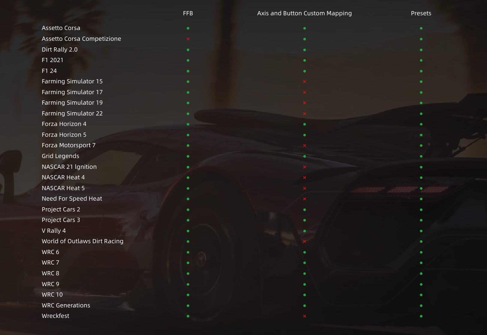 Compatible avec des dizaines de jeux de simulation de course grand public, notamment les séries Forza Horizon, Project CARS, F1, DiRT Rally et Assetto Corsa.