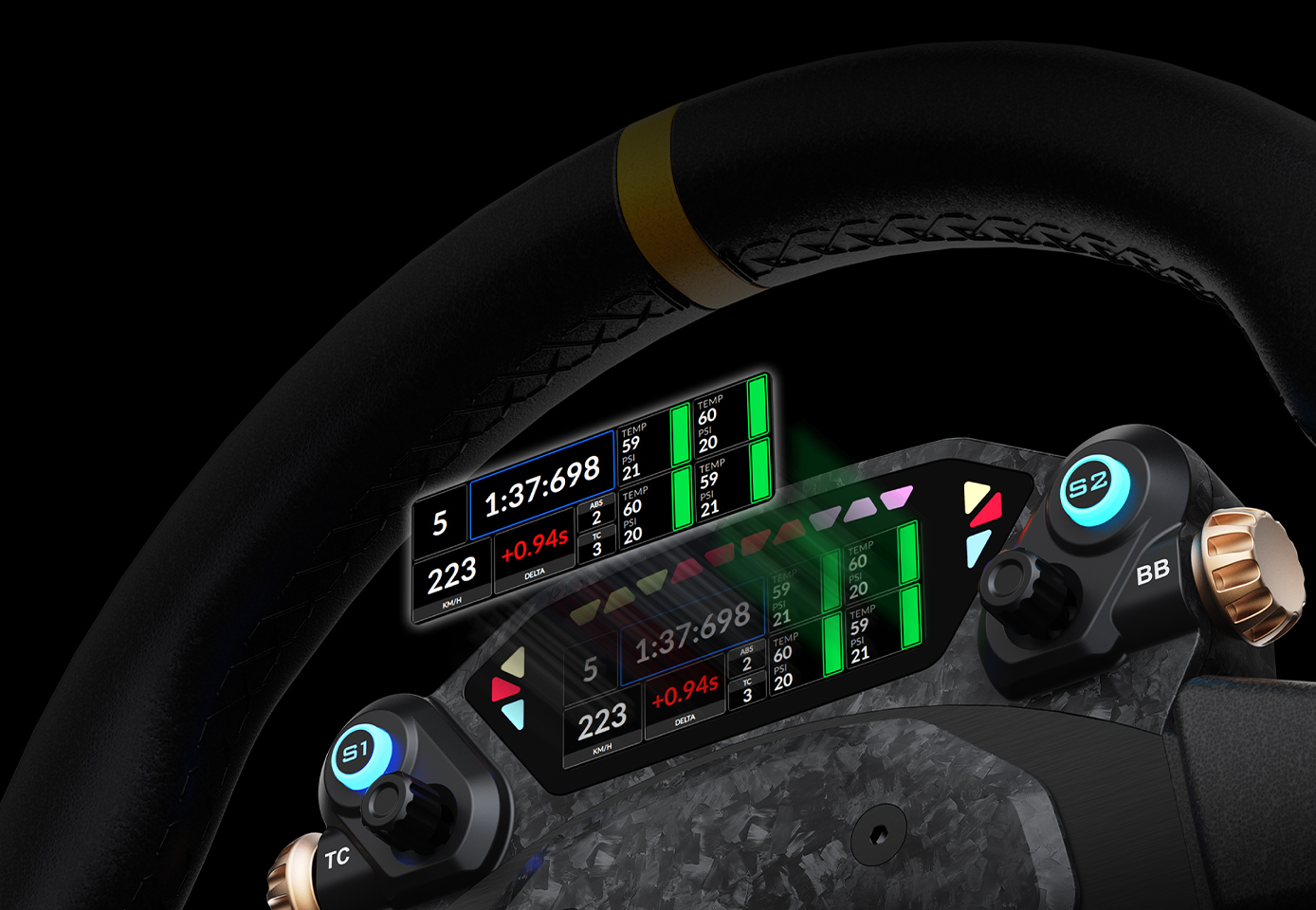 The forged carbon magnetic paddles with Hall sensors provide precise, consistent actuation. The dual-clutch system supports dual-clutch launches, single-clutch operation, or fully programmable inputs, giving drivers flexibility for different racing scenarios.