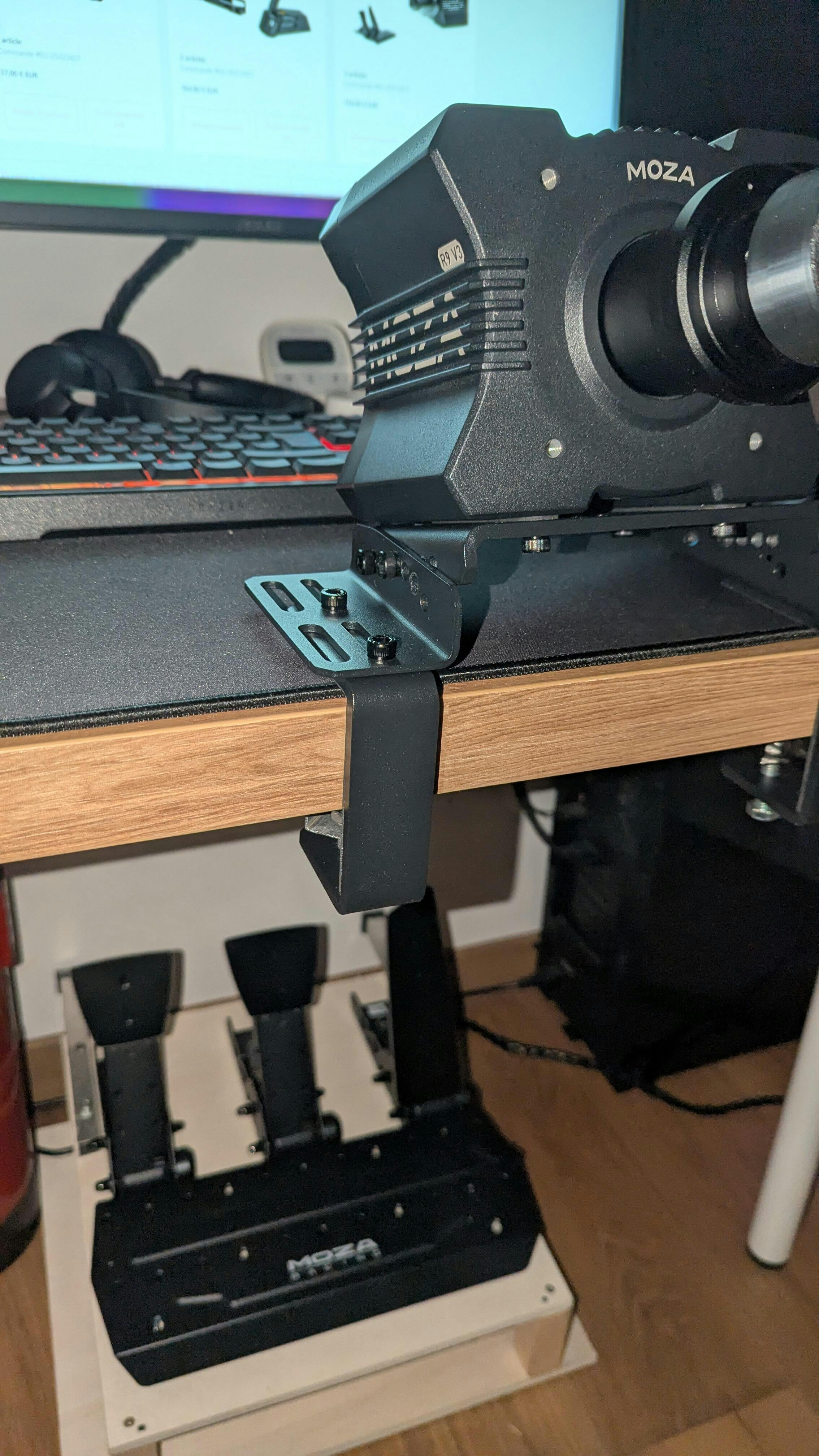 Crafted from high-strength CNC-machined steel, this desk clamp mount delivers exceptional rigidity and durability. The precision multi-angle adjustment ensures a stable and comfortable driving position, while the space-saving clamp design securely fits a wide range of desk thicknesses. With selected components also supporting aluminum profile rig mounting, it offers a versatile installation solution for MOZA R5, R9, and R12 direct drive wheel bases.